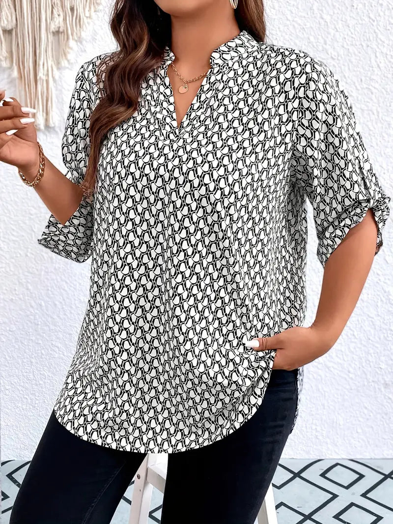 Wir stellen unser mühelos schickes Plus Größe Alloverdruck Roll Up Ärmel gekerbt Hals Tunika Top vor. Diese lässige Bluse wurde für die moderne Frau entworfen und kombiniert Komfort mit Stil auf höchst schmeichelhafte Weise. Der Allover-Print sorgt für einen Hauch von Flair, während der gekerbte Halsausschnitt einen subtilen, aber stilvollen Twist bietet. Perfekt für den Alltag, ob Sie nun Besorgungen machen oder sich mit Freunden zum Mittagessen treffen. Die aufrollbaren Ärmel sorgen für Vielseitigkeit und ermöglichen es Ihnen, Ihren Look mit Leichtigkeit zu verändern. Ergänzen Sie Ihre Garderobe noch heute mit diesem vielseitigen und stilvollen Tunika-Top!