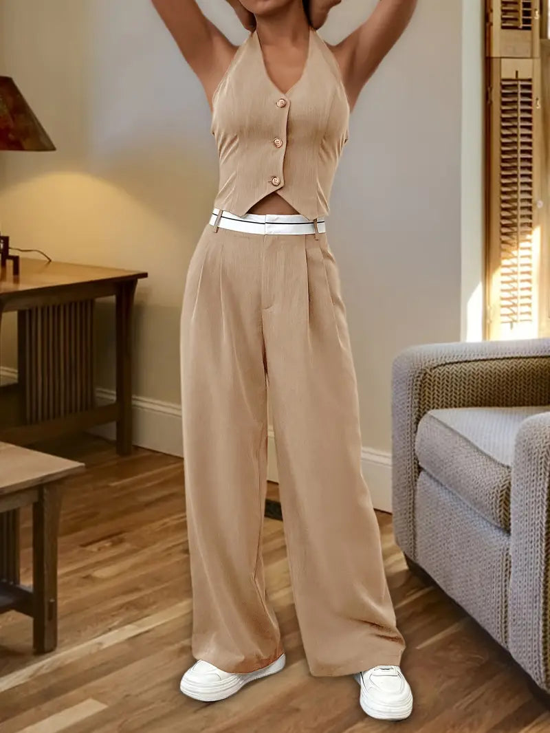 Unser stilvolles, einfarbiges zweiteiliges Set, das Ihre Garderobe mühelos aufwertet. Dieses Set besteht aus einem schicken Neckholder-Top mit Knopfleiste und einer raffinierten Anzughose mit weitem Bein. Aus hochwertigen Materialien gefertigt, bietet dieses Ensemble sowohl Stil als auch Komfort für jeden Anlass. Ganz gleich, ob Sie sich für eine formelle Veranstaltung herausputzen oder einen eleganten Alltagslook suchen, mit diesem vielseitigen Set sind Sie bestens ausgestattet. Erleben Sie modische Eleganz mit unserer Bekleidungskollektion für Damen.