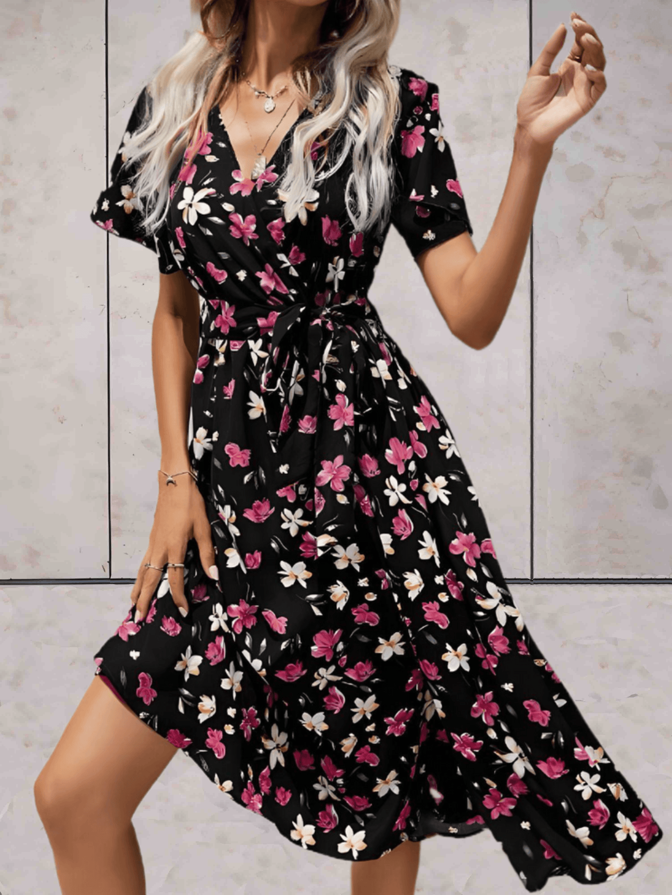 Bella: Kleid mit V-Ausschnitt, Blumendruck und Taillenband