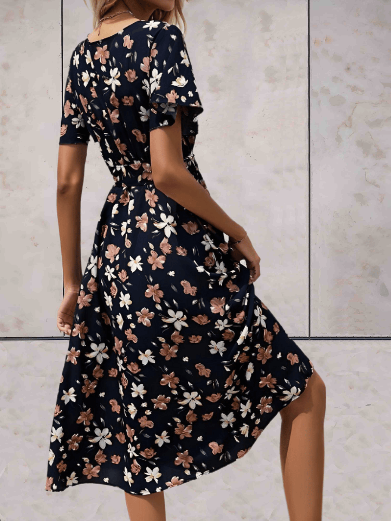 Spüren Sie die Frische des Sommers – mit dem 'Bella' V-Ausschnitt Kleid im Blumenprint!