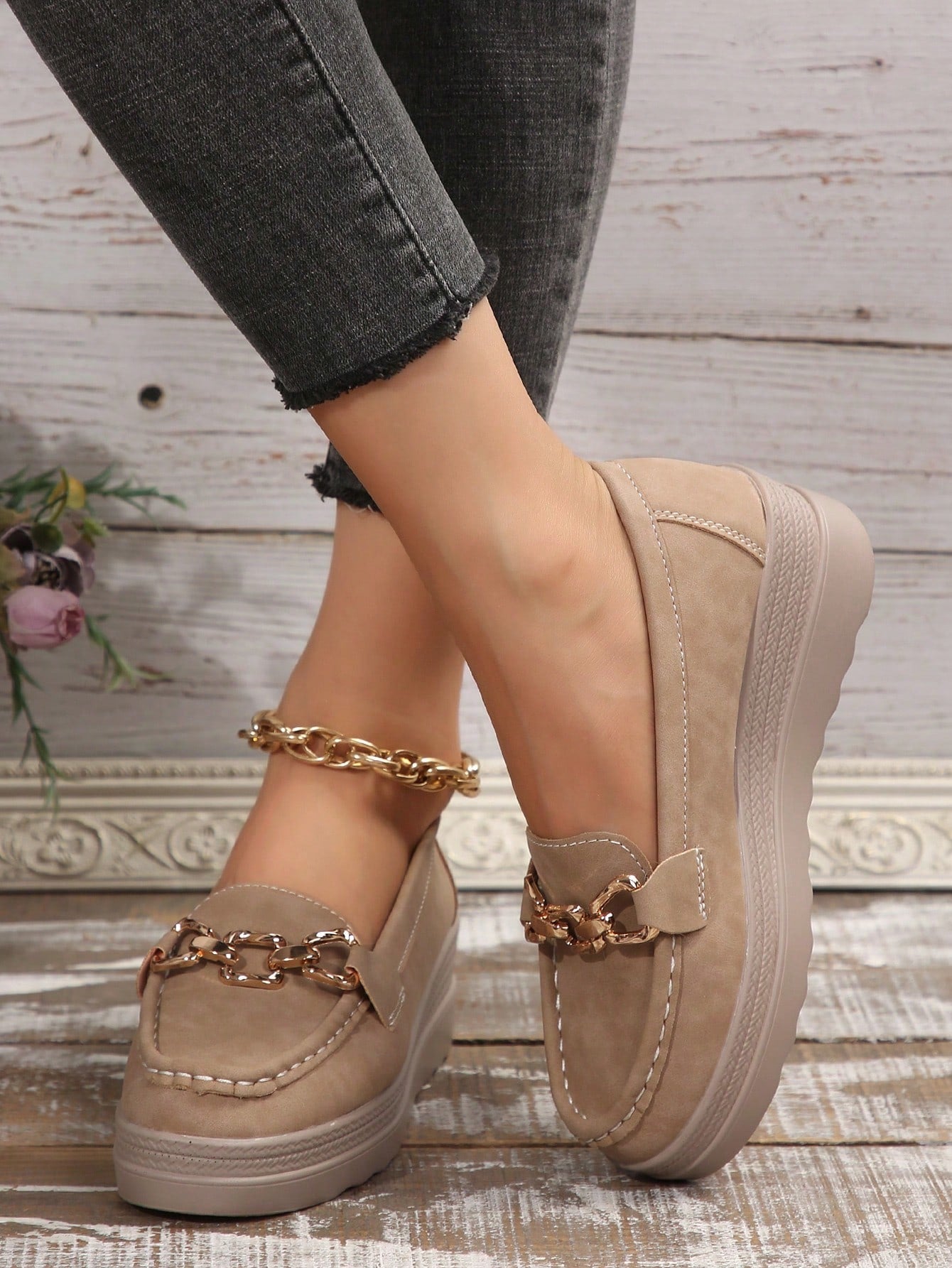 Diese stilvollen Loafers vereinen Komfort und Eleganz in einem modernen Design. Das weiche, strukturierte Obermaterial sorgt für ein angenehmes Tragegefühl, während die robuste Sohle optimalen Halt bietet – perfekt für den Alltag oder einen stilvollen Auftritt unterwegs. Das glänzende Metall-Detail verleiht dem Schuh einen Hauch von Raffinesse und macht ihn zum vielseitigen Begleiter für zahlreiche Outfits – von Jeans bis Sommerkleid.