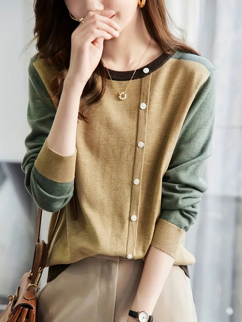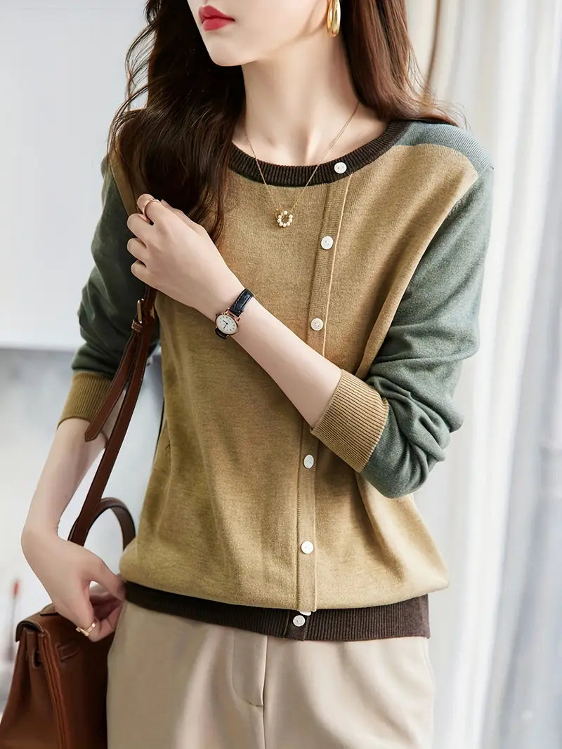 Peppen Sie Ihre Freizeitgarderobe auf mit unserem schicken Langarm-Stricktop für Damen in Farbblockoptik. Dieses vielseitige Oberteil mit modischem Rundhalsausschnitt und aus bequemem Stretchmaterial ist perfekt für Frühling und Herbst. Das auffällige Farbblockmuster verleiht ihm einen modernen Touch und macht es einfach, es mit Jeans, Röcken oder Shorts zu kombinieren. Egal, ob Sie sich für einen Tagesausflug schick machen oder es beim Brunch am Wochenende leger angehen lassen, dieses Stricktop bietet mühelosen Stil und Komfort. Bleiben Sie die ganze Saison über modisch und bequem mit diesem Must-have für Ihren Kleiderschrank.