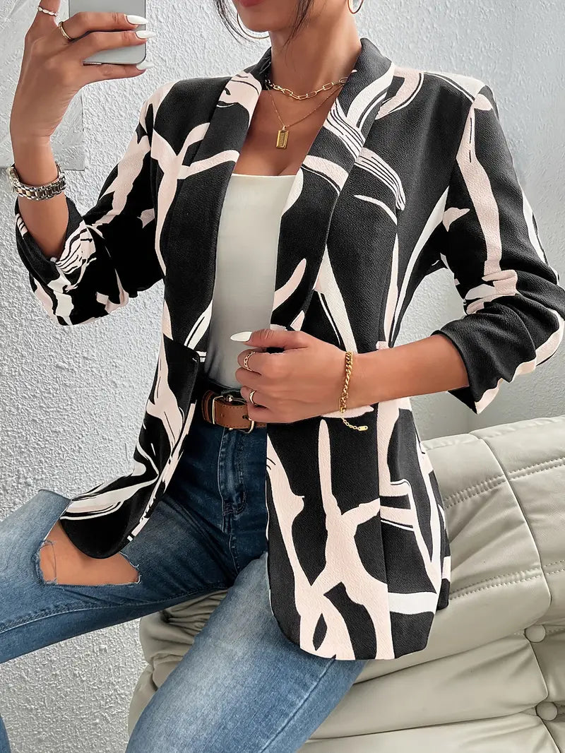 Dieser Blazer mit abstraktem Druck und Revers bringt einen modernen Touch in Ihre Bürogarderobe. Das auffällige abstrakte Design verleiht der klassischen Blazer-Silhouette ein einzigartiges Flair. Die Knopfleiste und das elegante Revers sorgen für ein gepflegtes und professionelles Erscheinungsbild. Die langen Ärmel und die bequeme Passform machen ihn zum idealen Begleiter für den ganzen Tag. Kombinieren Sie ihn mit einer Hose oder einem Rock, um Ihren Arbeitslook mühelos aufzuwerten.