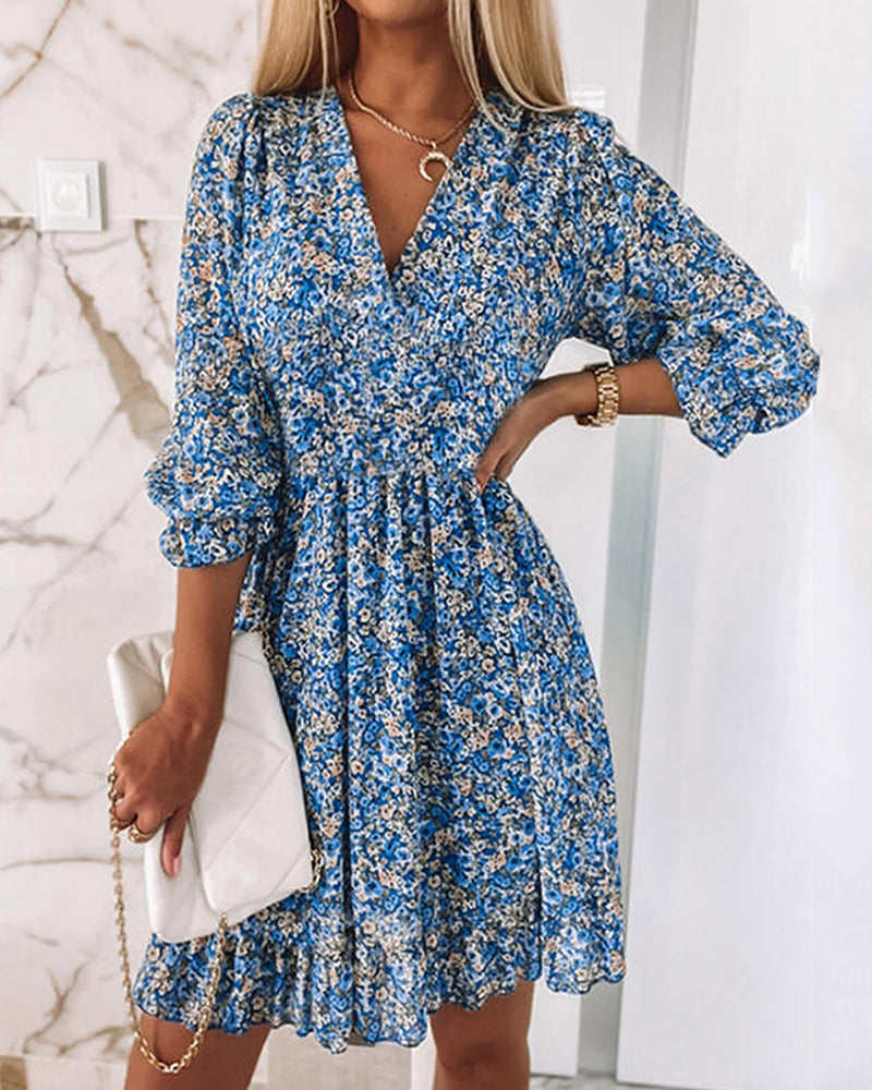 • Paket: Damen bedrucktes mittelhohes Blumenkleid mit Puffärmeln * 1