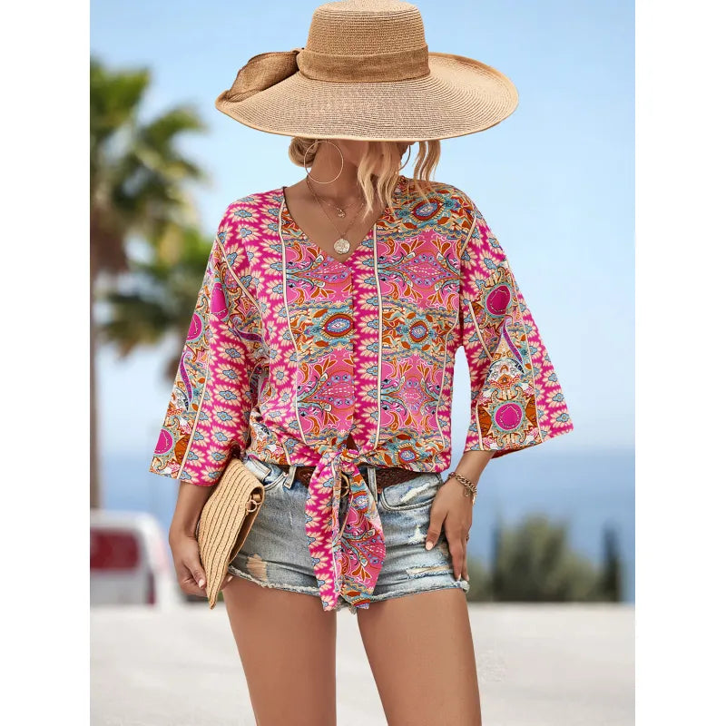 Wir präsentieren unsere Sommer Floral Print Tie Neck Bluse! Erhältlich in einer einzigen bezaubernden Farbe, ist diese Bluse eine entzückende Ergänzung für deine Sommergarderobe. Hergestellt aus einer Mischung aus leichter Baumwolle und atmungsaktivem Polyester, garantiert sie Komfort und Stil an sonnigen Tagen.Umarme feminine Eleganz mit diesem unverzichtbaren Stück, das ein wunderschönes Blumenmuster und ein schickes Bindehalsdetail bietet. Egal, ob du zu einer Gartenparty gehst oder einen gemütlichen Tag verbringst, diese Bluse bietet die perfekte Kombination aus Eleganz und Komfort. Veredele deinen Sommerlook mit diesem vielseitigen Grundnahrungsmittel, das zeitlose Schönheit ausstrahlt!