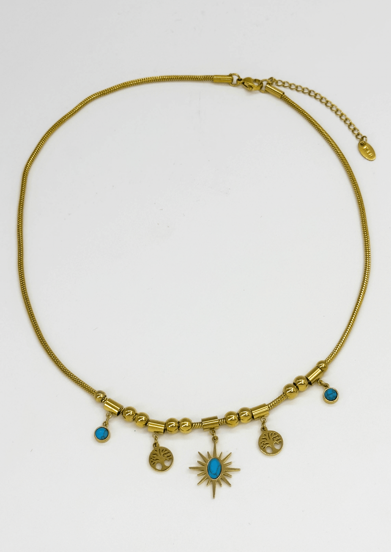 Die Bohemian Türkis-Anhänger Halskette aus Edelstahl besticht durch zarte türkisfarbene Anhänger, die jedem Outfit einen Hauch von Boho-Flair verleihen. Gefertigt aus robustem Edelstahl mit Goldfinish, vereint diese Halskette Eleganz und Widerstandsfähigkeit. Die verstellbare Länge sorgt für eine bequeme Passform und macht sie ideal für den täglichen Gebrauch oder besondere Anlässe.