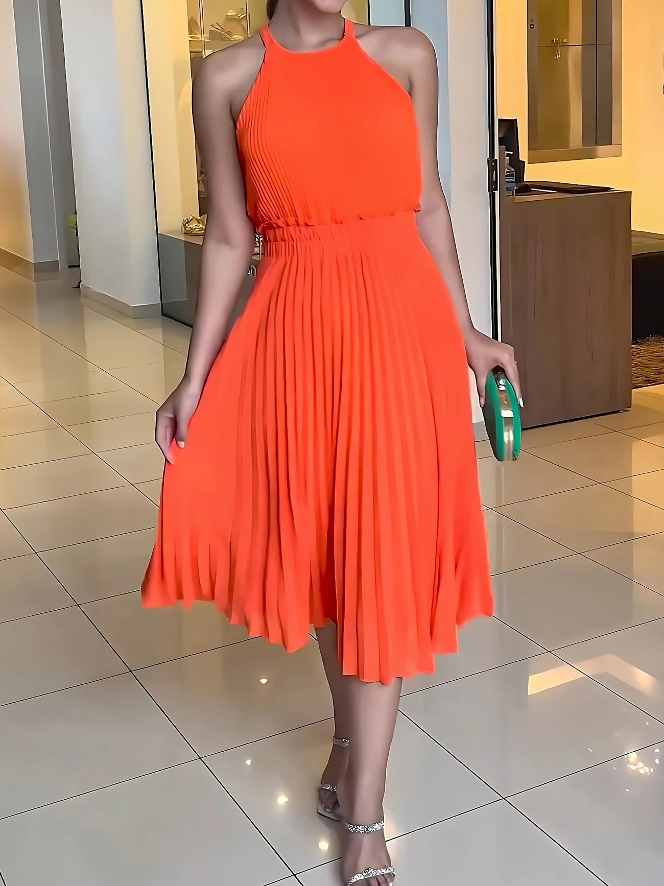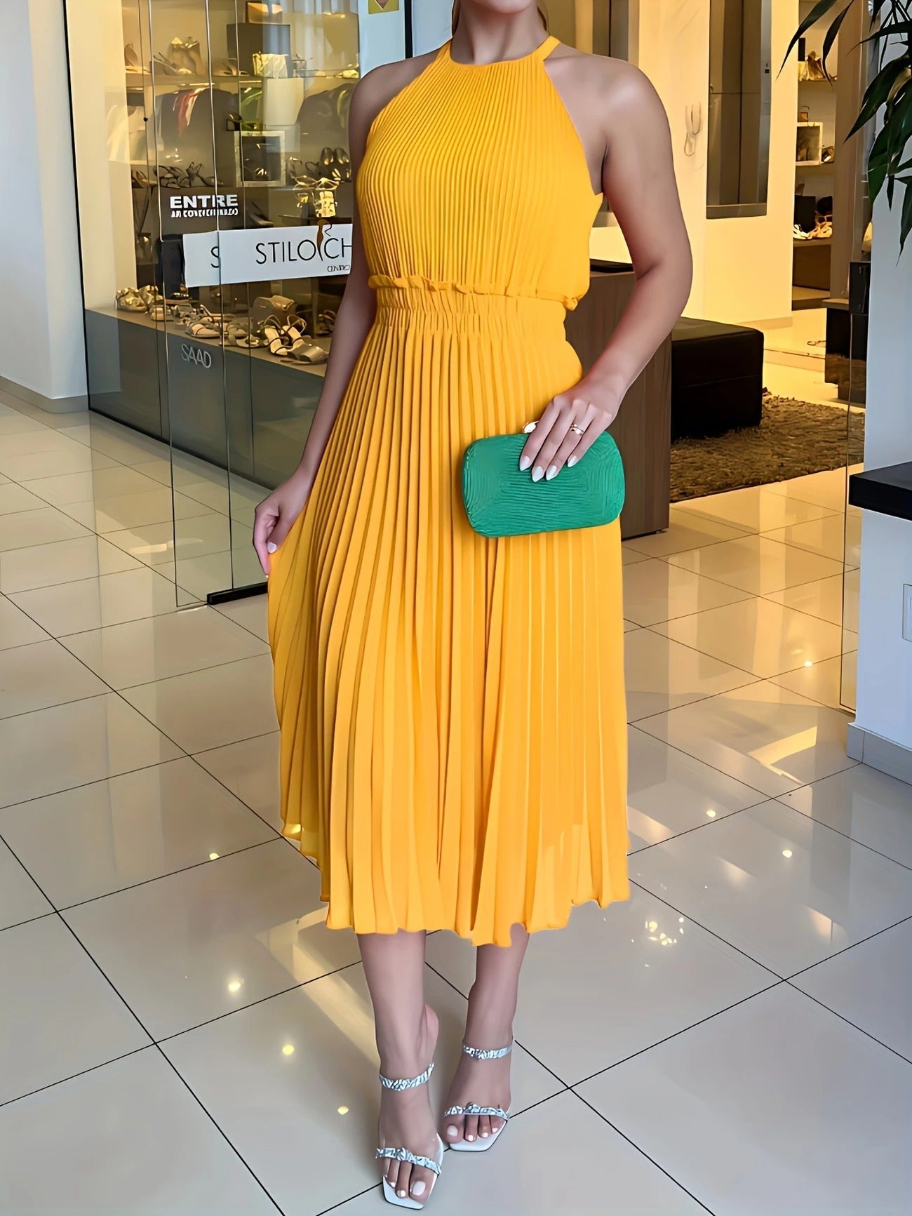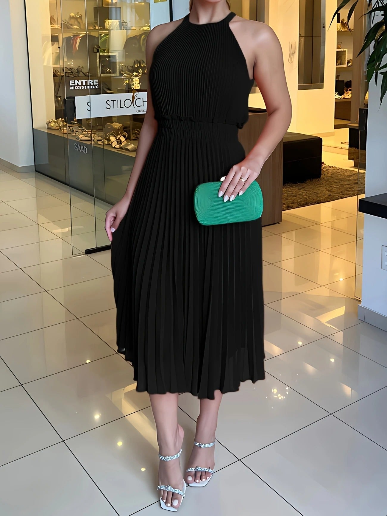 Das Claire Midikleid begeistert mit seinen feinen Plisseefalten, einem hochgeschlossenen, ärmellosen Schnitt und einer luftigen Silhouette, die bei jeder Bewegung anmutig mitschwingt. Der elastische Taillenbund sorgt für eine schöne Form, während die knie- bis wadenlange Länge es zu einem stilvollen Begleiter für verschiedenste Anlässe macht – ob festlich, entspannt oder im Alltag.