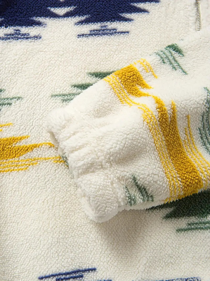 Geometrische Musterdetails: Das Sweatshirt besticht durch seine lebhaften geometrischen Muster, die ihm eine unverwechselbare Note verleihen. Diese auffälligen Gestaltungen verwandeln einen einfachen Fleece in ein stilvolles Statement-Stück. Durch seine optische Attraktivität lässt es sich vielseitig mit Jeans, Jogginghosen oder Freizeithosen kombinieren.