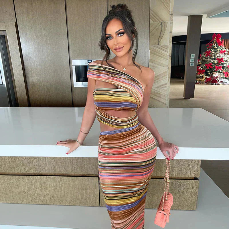 Dieses Kleid kombiniert stilvolle Cut-Outs mit einem hohen Schlitz und schafft so eine moderne, feminine Silhouette. Ideal für Abende, Partys oder besondere Anlässe – perfekt für Frauen, die selbstbewusste Mode lieben.