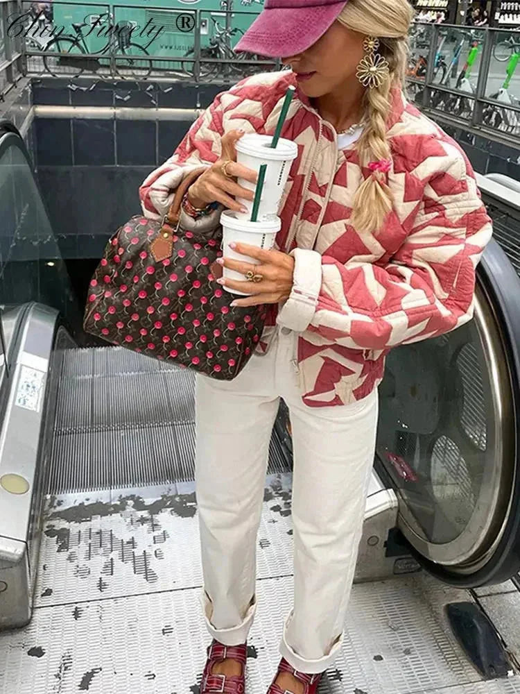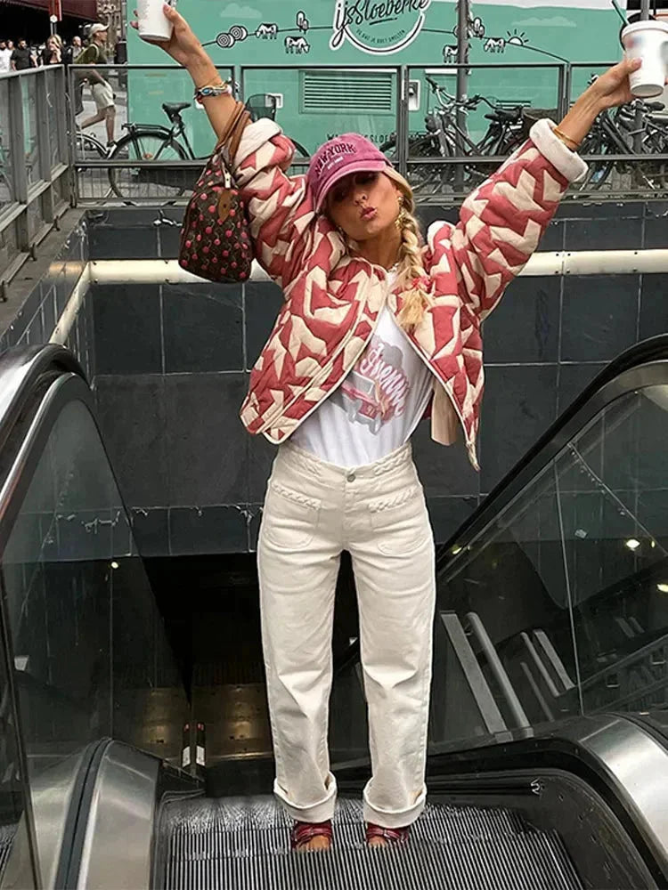 Verleihen Sie Ihrem Outfit mit dieser trendigen Damen Bomberjacke in Rot und Weiß eine farbenfrohe und stilvolle Note. Perfekt für kühle Tage, setzt diese Jacke mit ihrem auffälligen geometrischen Muster einen modischen Akzent, während sie praktischen Komfort bietet. Tragen Sie sie zu sowohl legeren als auch schickeren Anlässen und genießen Sie den idealen Mix aus Mode und Funktionalität.