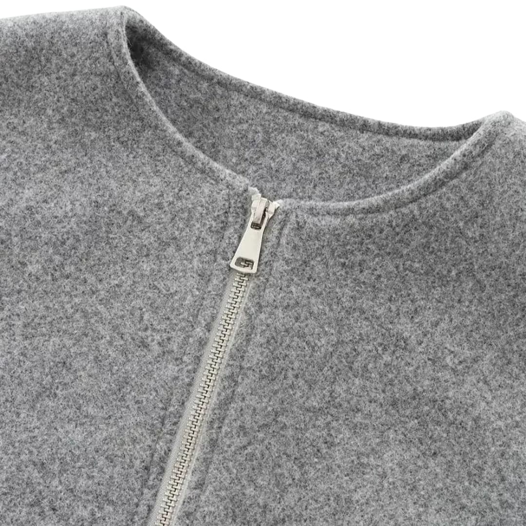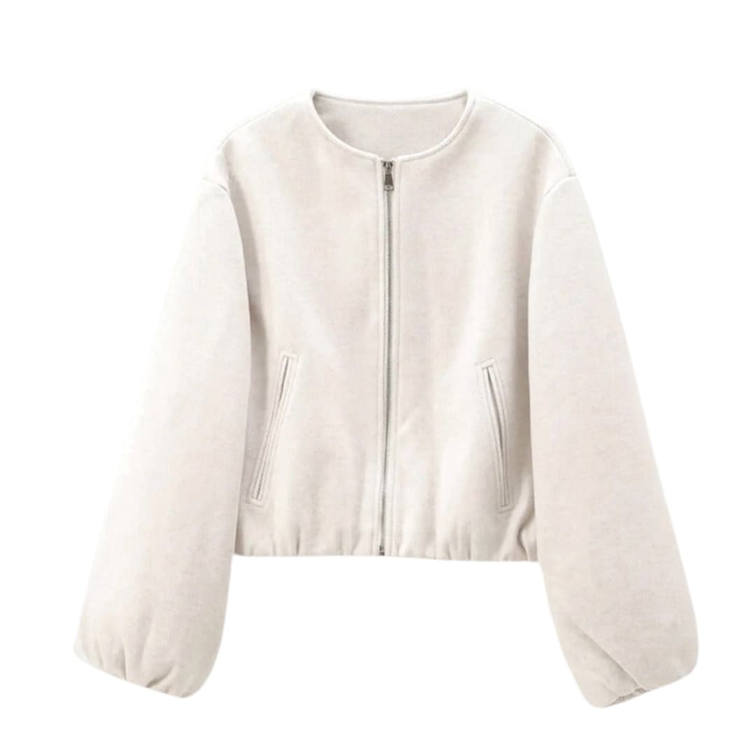 Diese Damen Bomberjacke ist mit einem Rundhalsausschnitt und einem durchgehenden Frontreißverschluss gestaltet. Zwei seitliche Eingrifftaschen im vertikalen Design ergänzen den Look. Die langen, ballonförmigen Ärmel enden in elastischen Bündchen. Der kurze Saum sorgt für eine klare Silhouette, während die schlichte Weboberfläche ein zurückhaltendes Erscheinungsbild verleiht.