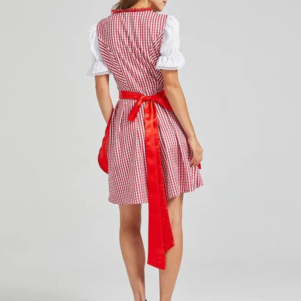 Erleben Sie die magische Atmosphäre des Oktoberfestes mit diesem eleganten Dirndlkleid. Das Kleid umschmeichelt Ihre Figur und lässt Sie feminin und selbstbewusst auftreten. Das klassische Karomuster, kombiniert mit einer lebhaften Schürze, verleiht Ihnen einen zeitlosen Charme, der alle Blicke auf sich zieht.