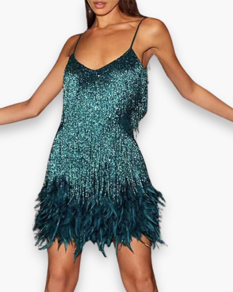 Entdecken Sie unser stilvolles Cocktailkleid, das Eleganz und modernen Chic vereint. Dieses Kleid ist ideal für besondere Anlässe und sorgt dafür, dass Sie im Mittelpunkt stehen. Mit einem Design, das die glamouröse Ästhetik der goldenen 20er-Jahre aufgreift, ist es perfekt für jede Cocktailparty oder modische Veranstaltung.