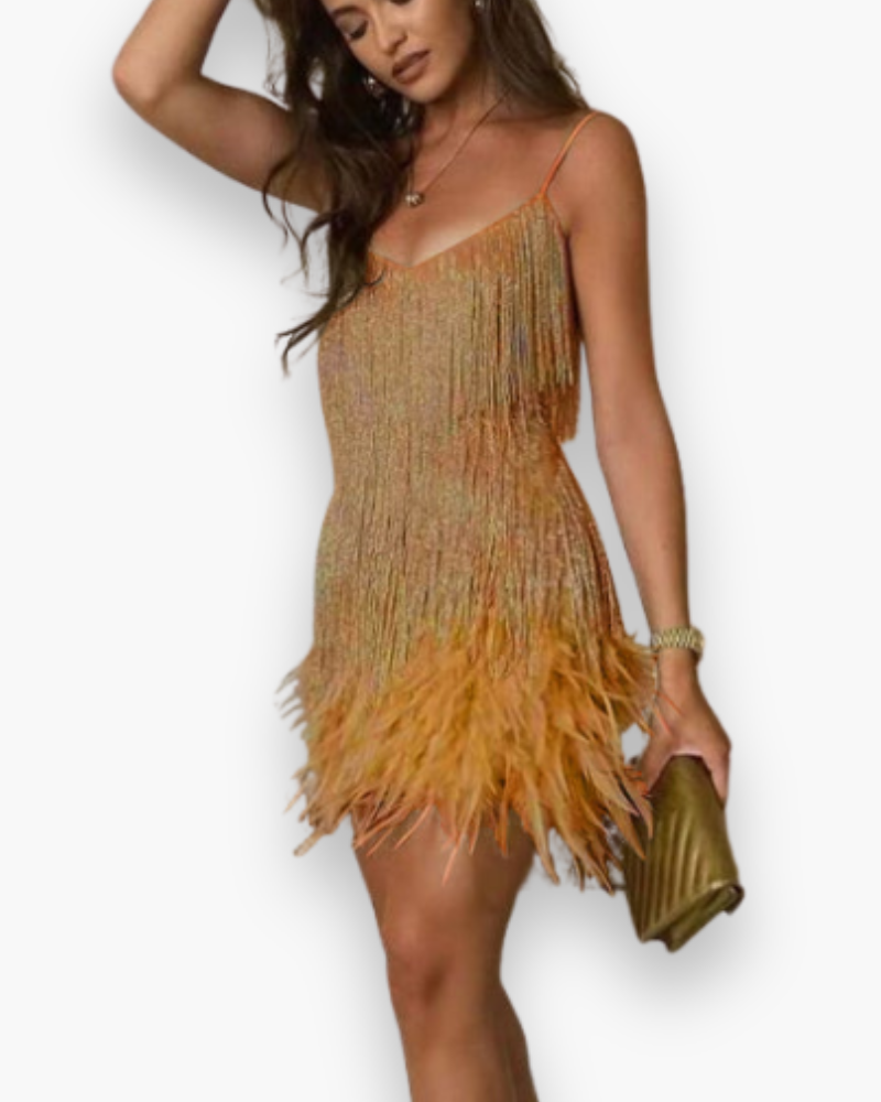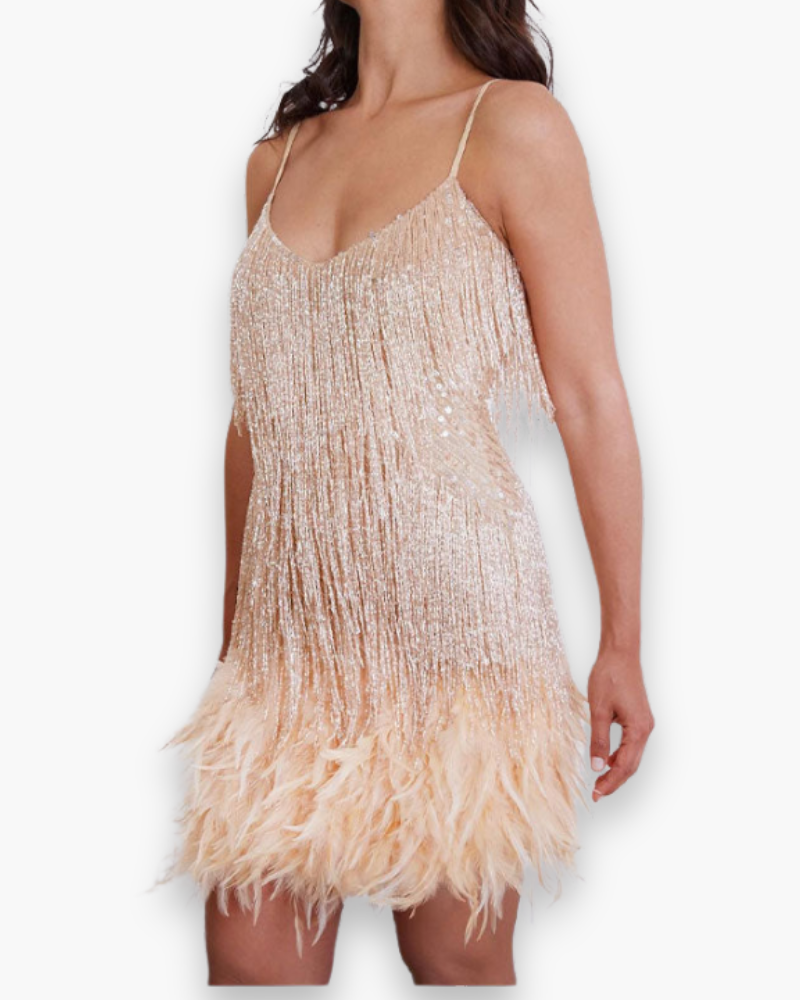 - Federn am Saum für einen Hauch von Extravaganz und Stil.