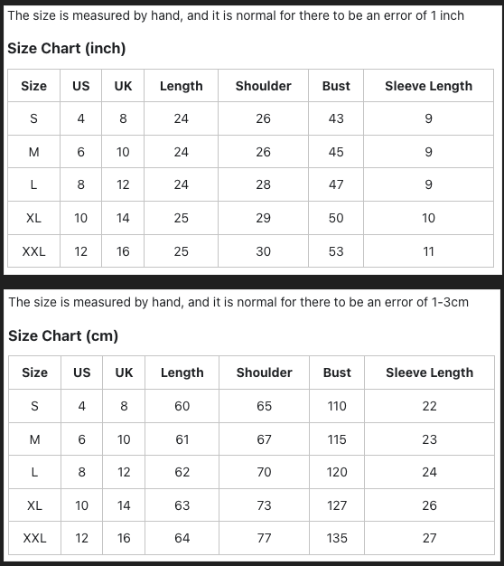 Größentabelle für Damenoberteile ( Shirt, Bluse, Sweatshirt und Jacken)