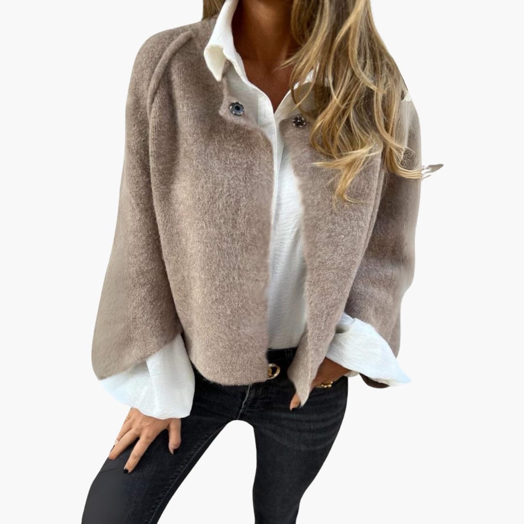 Diese Damenjacke hat einen Rundhalsausschnitt mit einem Verschluss aus zwei Knöpfen. Das kurze Design umfasst lange Ärmel und eine schlichte strukturierte Oberfläche. Der gerade Saum und der lockere Schnitt machen sie vielseitig kombinierbar für Übergangszeiten.