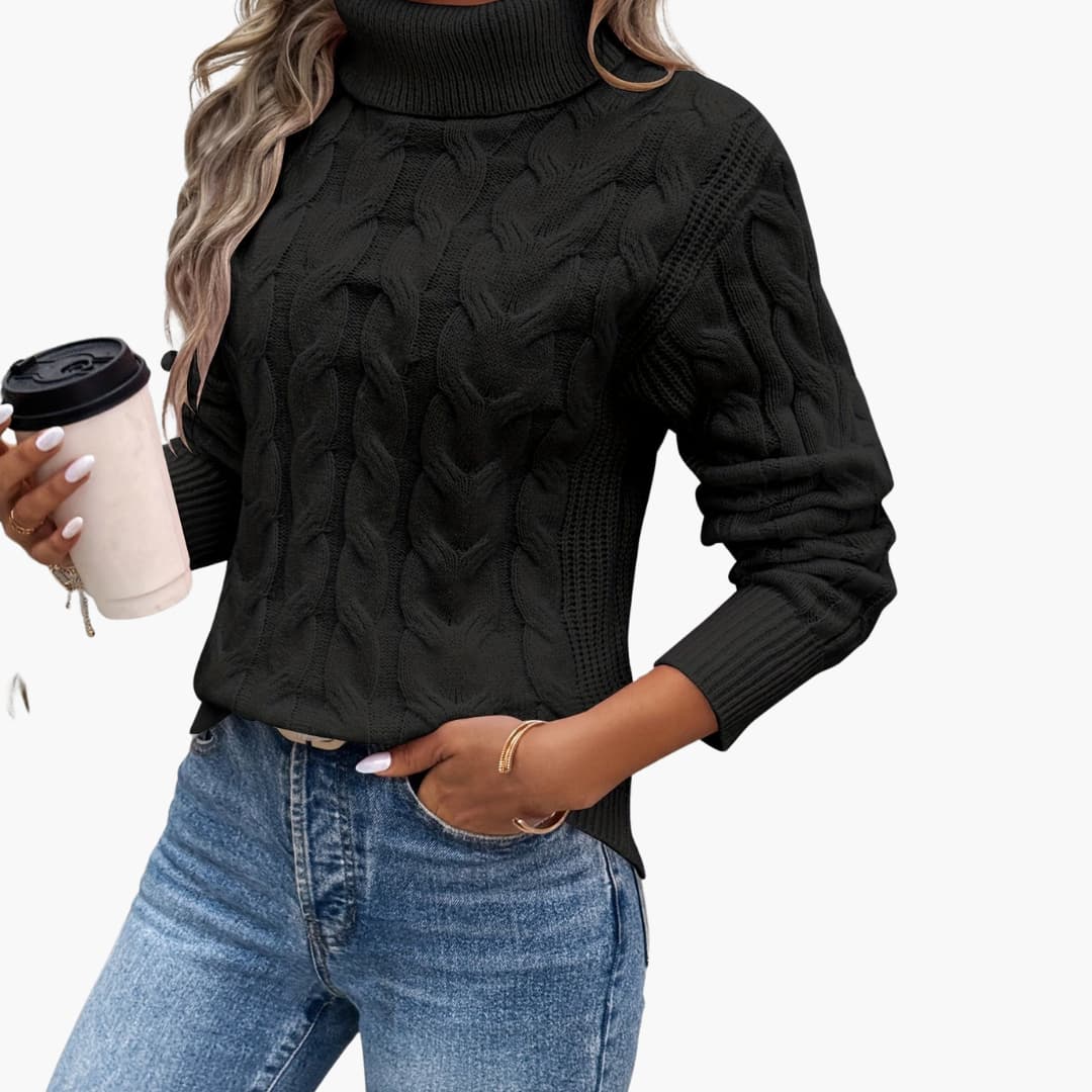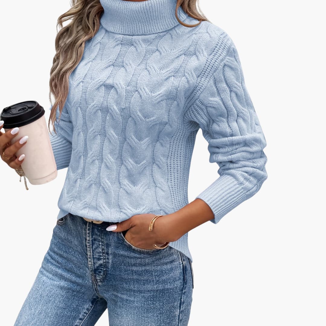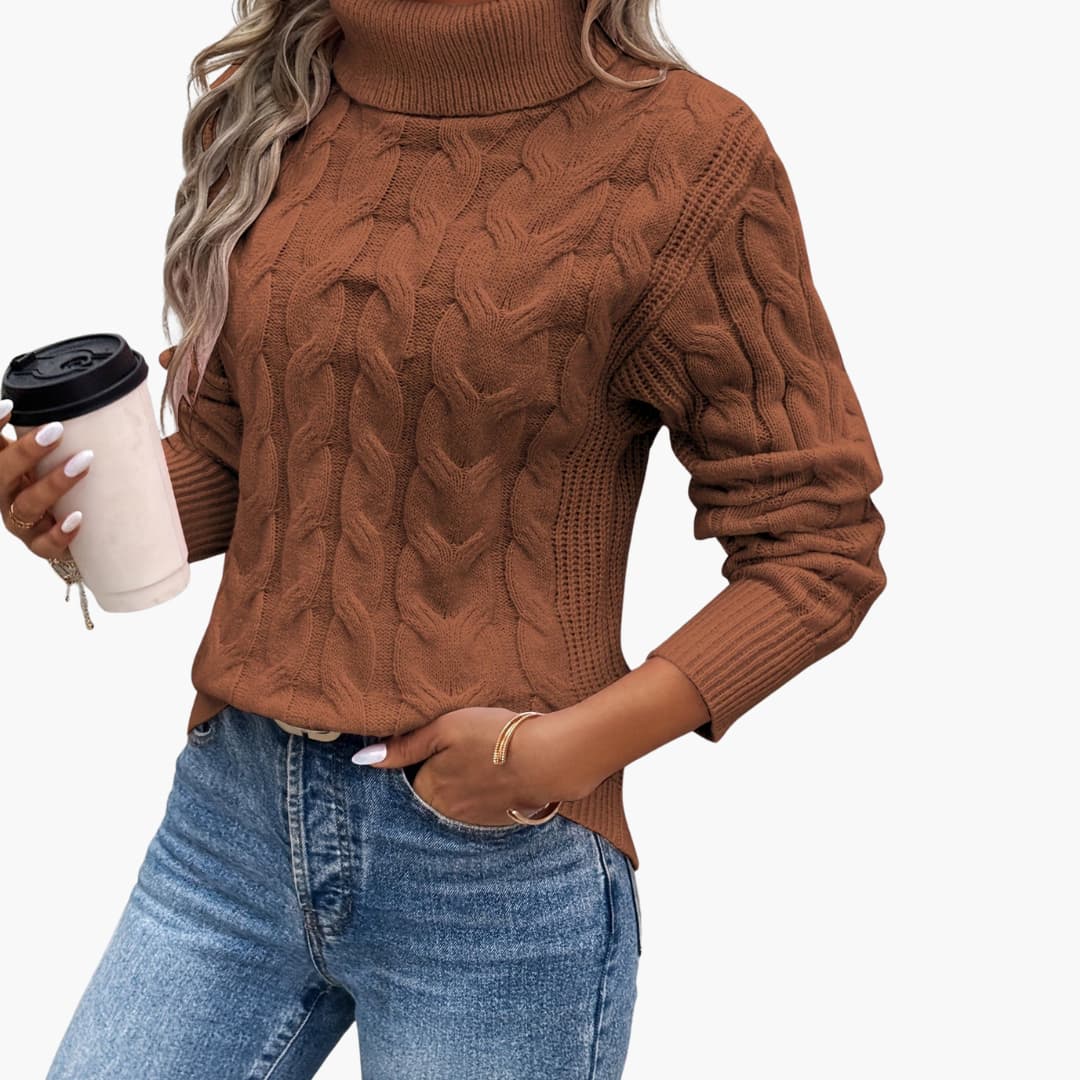 Zopfmuster-Rollkragenpullover für Damen mit gerippten Bündchen und Saum.