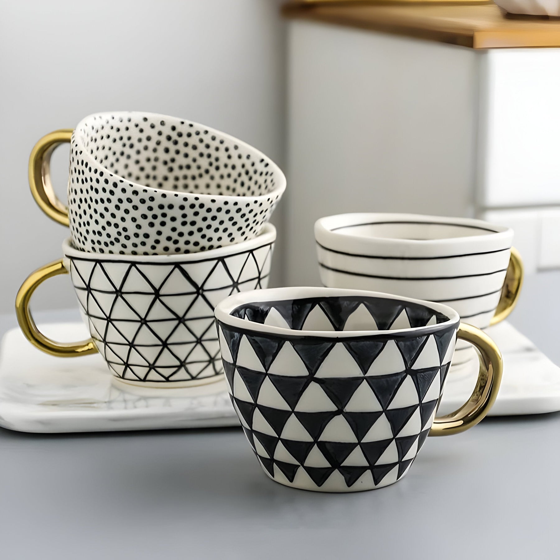 Die GeoSip Cup bringt ein Stück moderne Eleganz auf deinen Frühstückstisch. Mit ihrer einzigartigen, geometrischen Form und dem goldenen Henkel ist sie mehr als nur eine Tasse – sie ist ein Designstatement. Ob für deinen morgendlichen Kaffee, den Matcha am Nachmittag oder einfach als Deko – diese Tasse zieht Blicke auf sich. Genieße deine Lieblingsgetränke mit Stil und einem Hauch von Luxus.