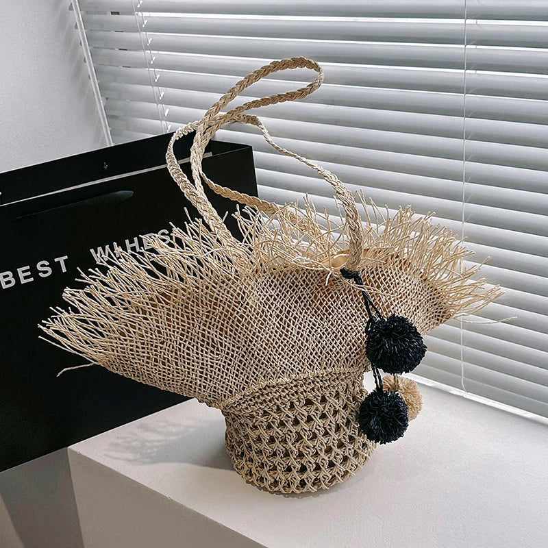 Diese handgewebte Strohtasche vereint natürliches Design mit funktionalem Komfort. Ob am Strand, auf Reisen oder beim Stadtbummel – sie bietet ausreichend Platz für alles, was du unterwegs brauchst: Handtücher, Bücher, Snacks und mehr. Die leichten Schulterriemen sorgen für angenehmes Tragen, auch wenn die Tasche vollgepackt ist.
