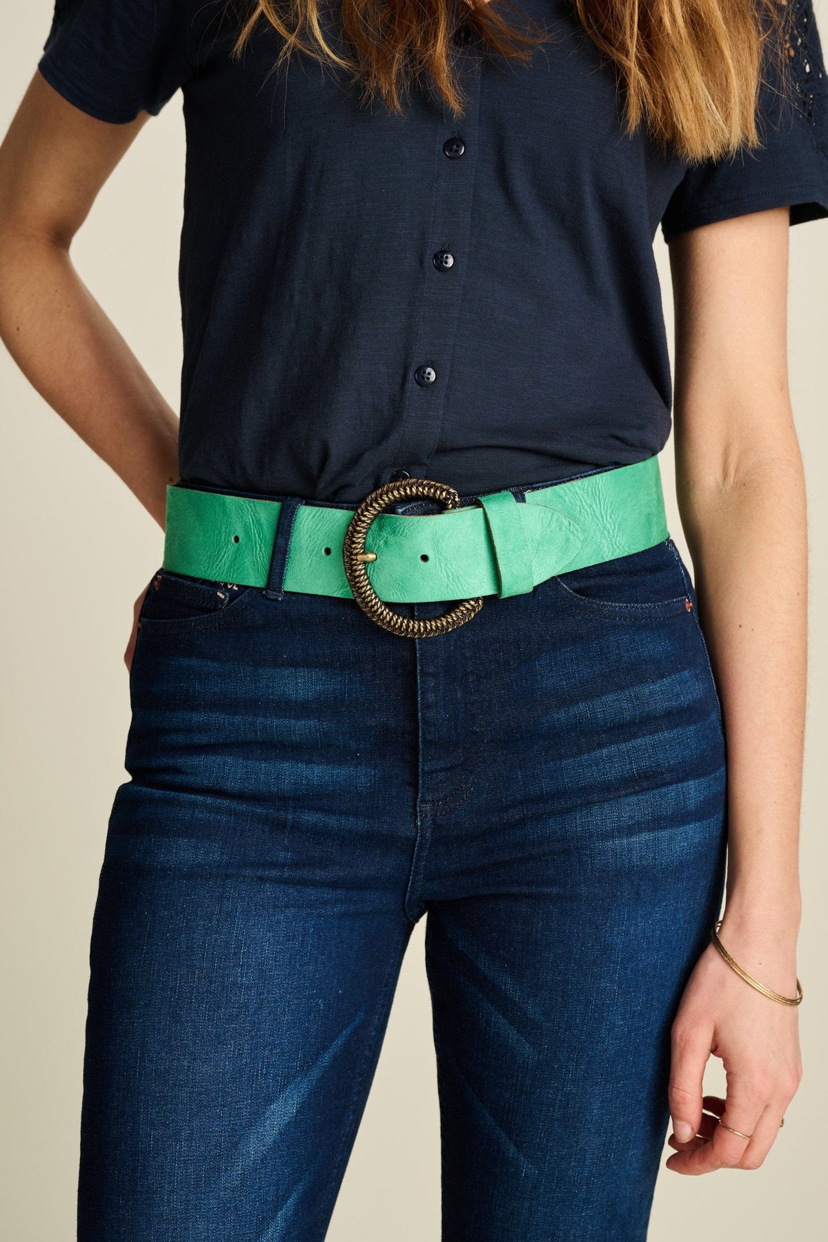 Der Lola Wildledergürtel in Matcha-Grün besticht durch seine feine Wildledertextur in einem sanften Matcha-Grün-Ton, ergänzt durch eine polierte goldene Schnalle. Die verstellbare Passform sorgt für Komfort und macht ihn zum idealen Accessoire für den täglichen Gebrauch oder besondere Anlässe.