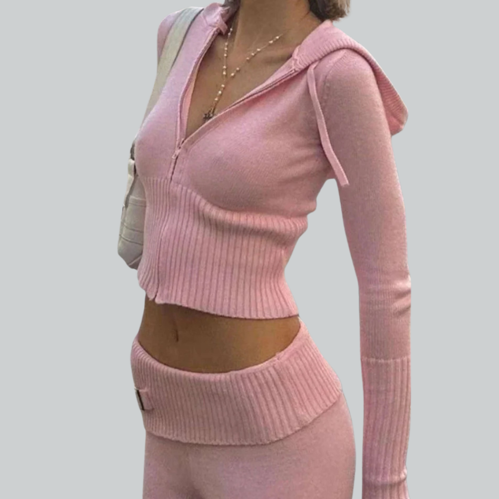 Dieses zweiteilige Set bestehend aus cropped Hoodie mit Zipper und Hüfthose ist ein echtes Fashion-Statement. Inspiriert vom Y2K-Trend, bringt es Retro-Flair zurück – perfekt für Fashionistas, die Streetwear mit Persönlichkeit lieben.