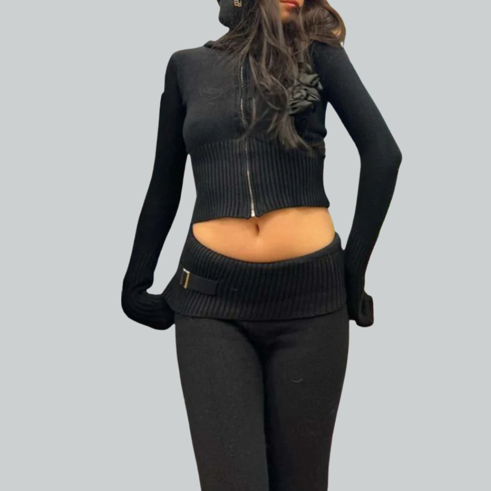 Der hochwertige, elastische Strickstoff schmiegt sich angenehm an die Haut und sorgt für einen figurbetonten Look. Das breite Bündchen am Oberteil formt die Taille, während der tiefe Sitz der Hose den Hüftbereich stylisch betont.