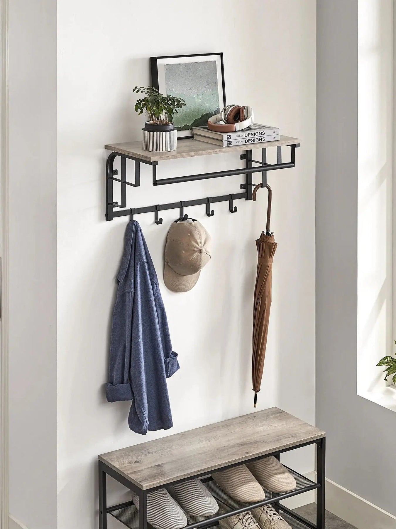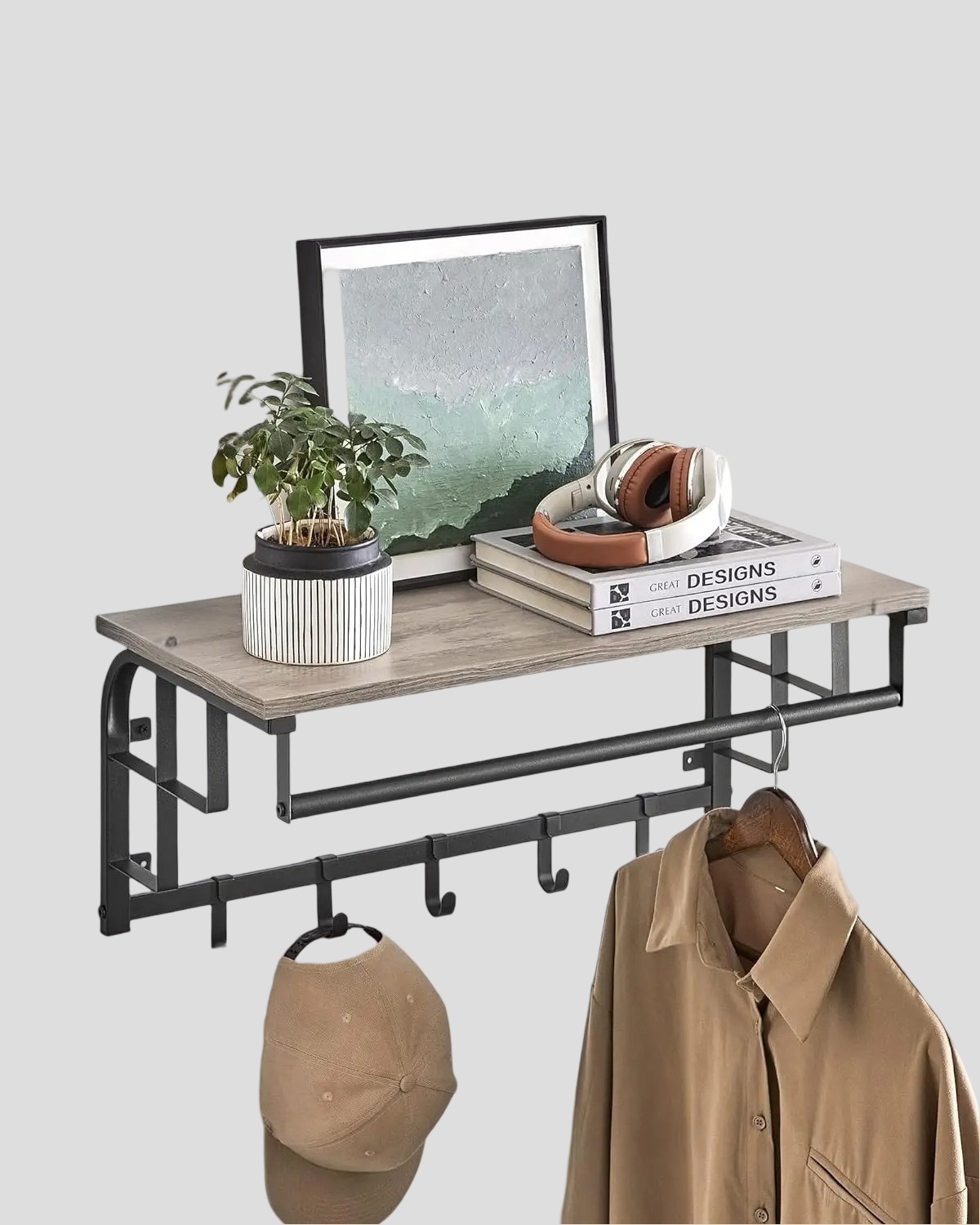 Dieses Wandregal vereint eine großzügige Ablagefläche, fünf abnehmbare Haken und eine Kleiderstange, sodass Sie Jacken, Taschen, Hüte und andere Accessoires ordentlich aufbewahren können. -
