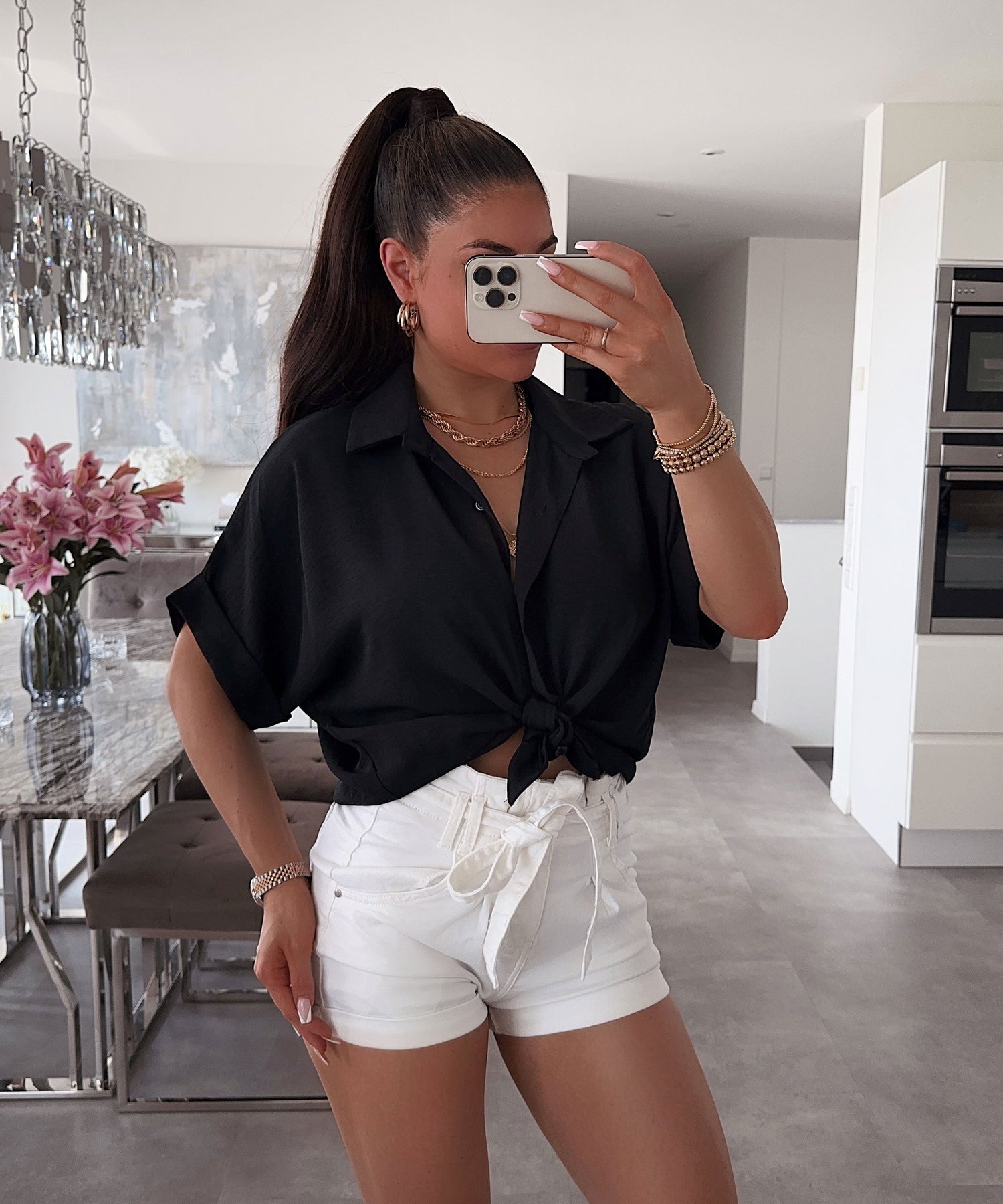 Mit klassischem Rundhalsausschnitt, kurzen Ärmeln und leicht taillierter Form betont das schwarze T-Shirt auf natürliche Weise die Figur. Der tiefe Schwarztton verleiht jedem Outfit Eleganz und Vielseitigkeit.