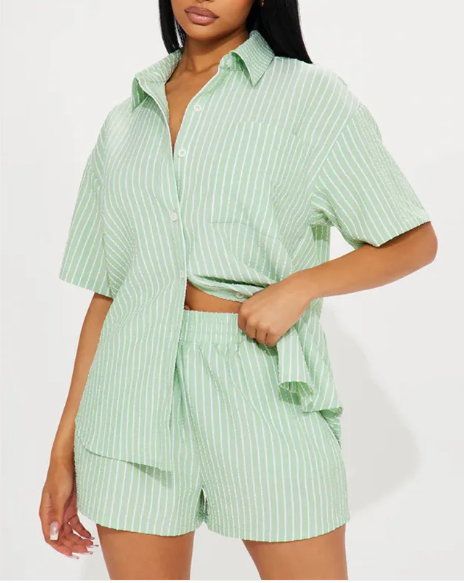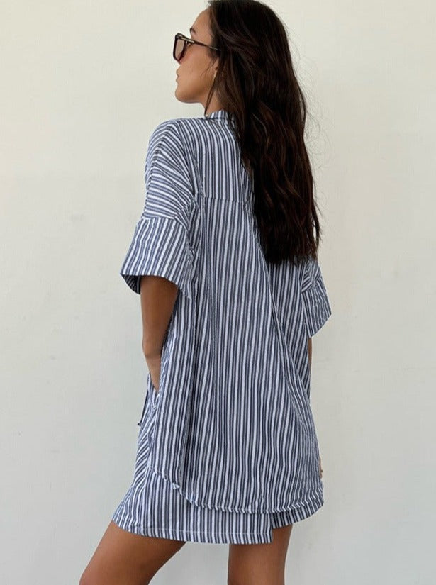 Dieses zweiteilige Set vereint lockeren Komfort mit klassischem Streifendesign und kurzen Ärmeln. Perfekt zum Entspannen, für Erledigungen oder lässige Ausflüge – ideal für Frauen, die legere Mode mit sportlichem Flair lieben.