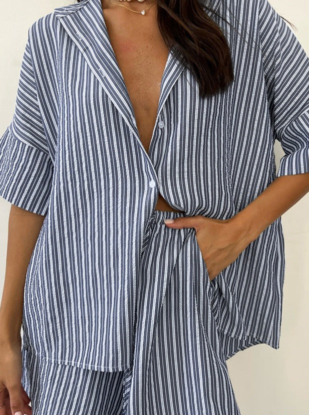 Lässiges zweiteiliges Set mit weißen Streifen und kurzen Ärmeln für Frauen