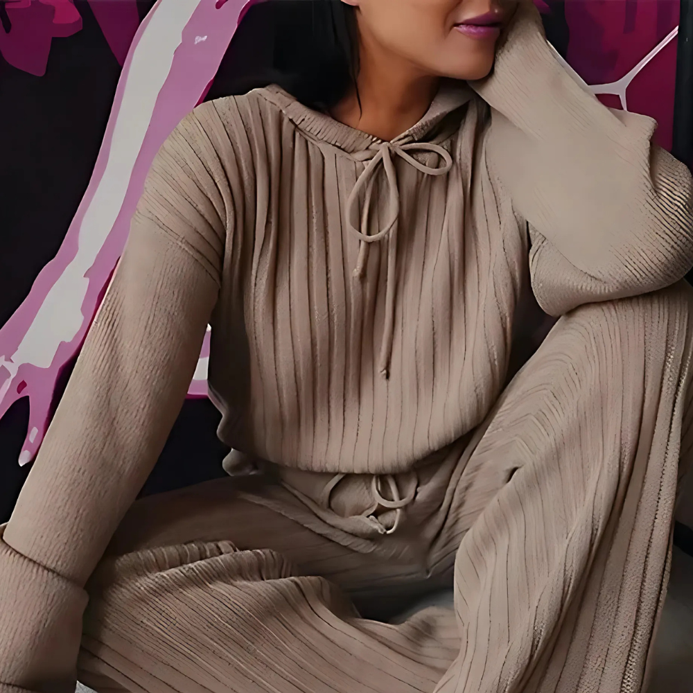 Dieses zweiteilige Set aus weich geripptem Material ist Leannes Geheimnis für stilvolle Wohlfühlmomente. Der lockere Schnitt, kombiniert mit dem zarten Taupe-Ton, strahlt pure Gelassenheit aus – ob beim Homeoffice, beim Kaffeetrinken oder einfach zum Relaxen auf dem Sofa.