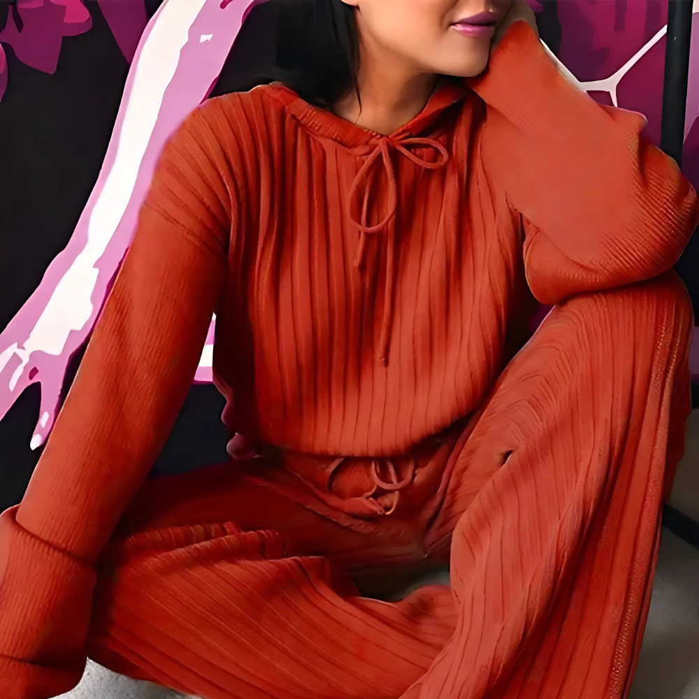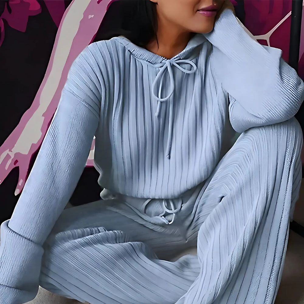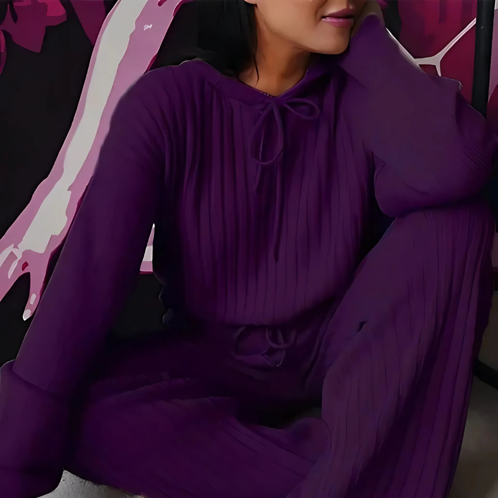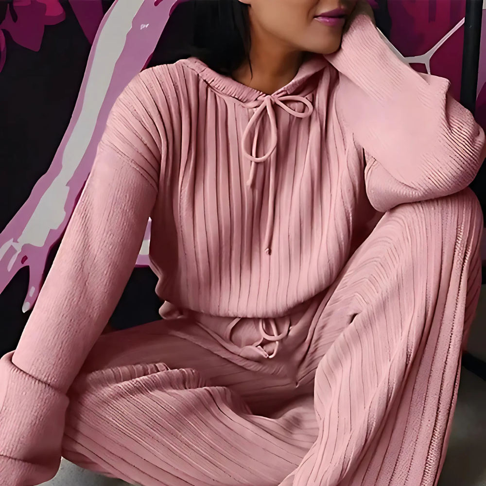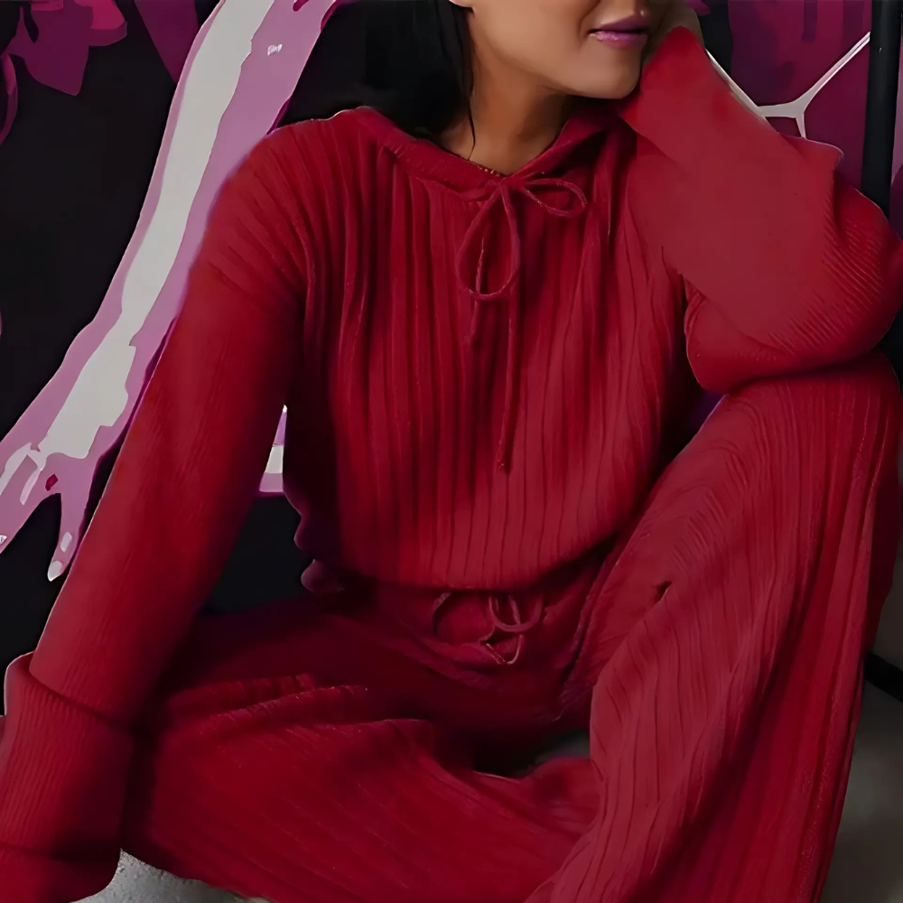 Mit Kapuze, Zierkordel und weitem Bein überzeugt das Set durch funktionale Details mit modischem Flair. Der Stoff fühlt sich angenehm auf der Haut an und bietet Bewegungsfreiheit ohne Einengen – perfekt für alle, die sich auch in Loungewear schön und selbstbewusst fühlen wollen.