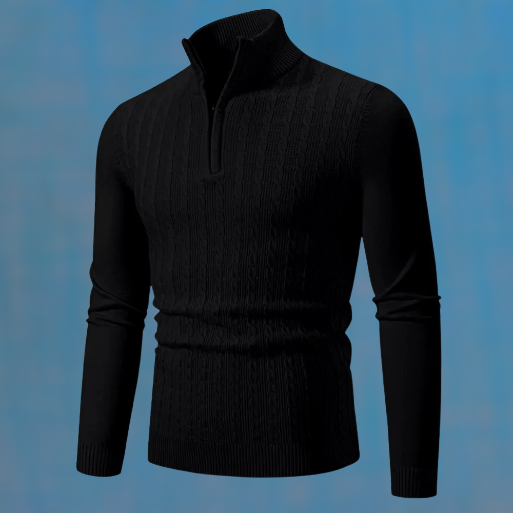 Das strukturierte Zopfmuster verleiht dem Pullover Tiefe, während der Reißverschluss-Kragen flexibel bleibt – offen für einen lässigen Look oder hochgeschlossen für kühle Tage. Das weiche Material garantiert dabei ein angenehmes Tragegefühl.
