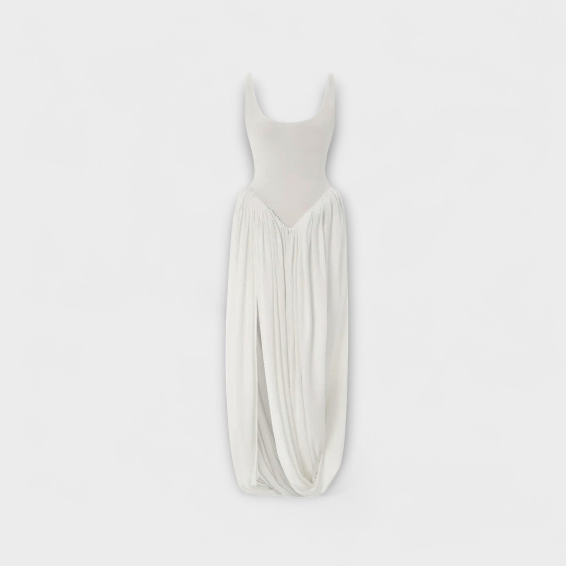 Maxikleid mit drapiertem Oberteil, skulpturalem Rock und seitlichem Schlitz