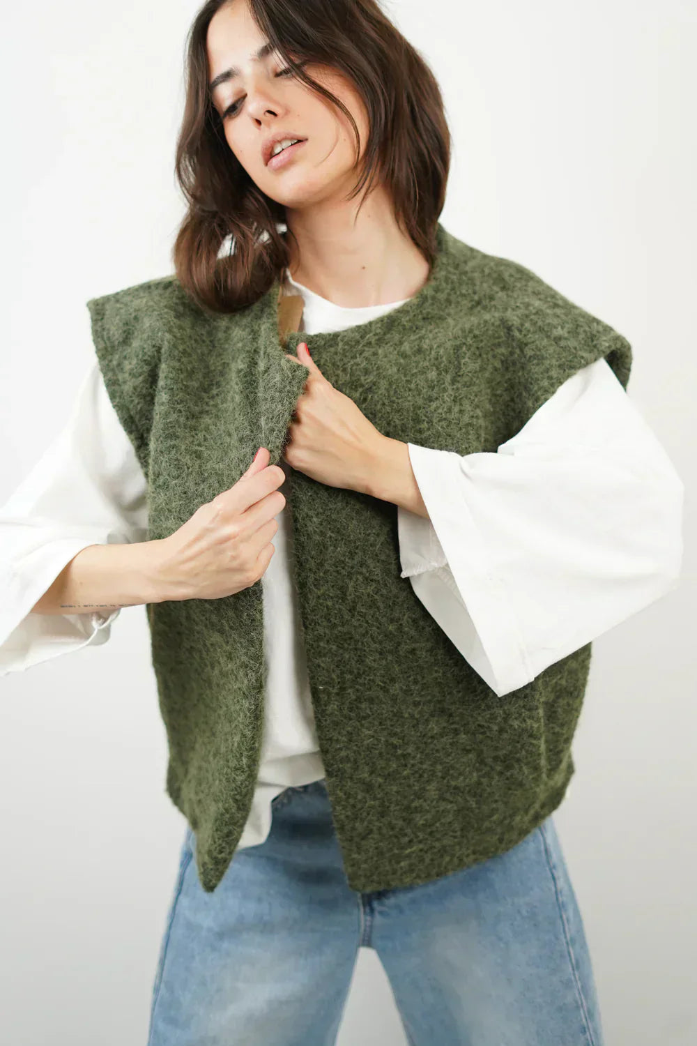 Diese ärmellose Weste ist ein Must-have für stilbewusste Frauen, die Komfort und Eleganz gleichermaßen schätzen. Ihr zeitloses Design macht sie zu einem vielseitigen Kleidungsstück, das mühelos in jede Garderobe integriert werden kann.