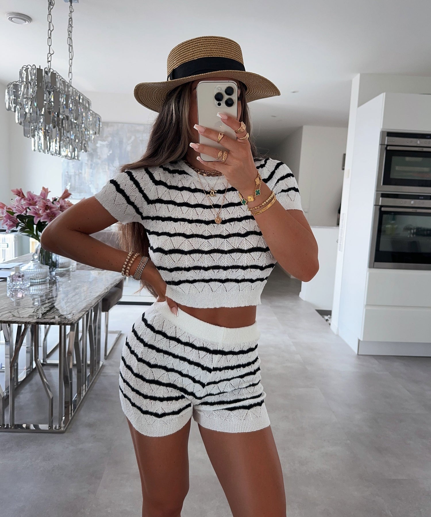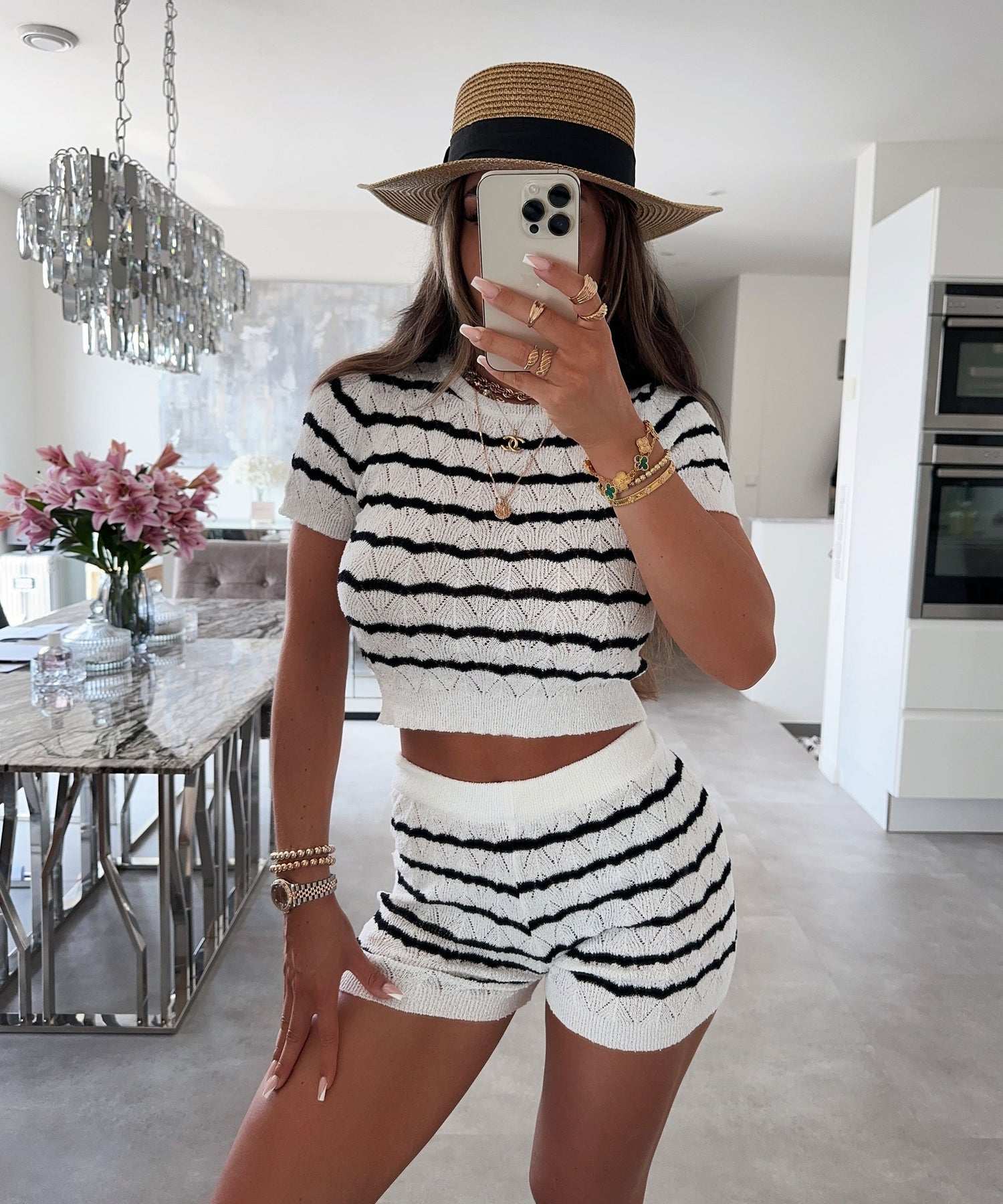 Gefertigt aus Baumwolle, Viskose oder leichten Strickmischungen bietet das Material ein angenehmes, atmungsaktives Tragegefühl und präsentiert ein zartes Strukturmuster. Es sorgt für Komfort und setzt gleichzeitig stilvolle Akzente.