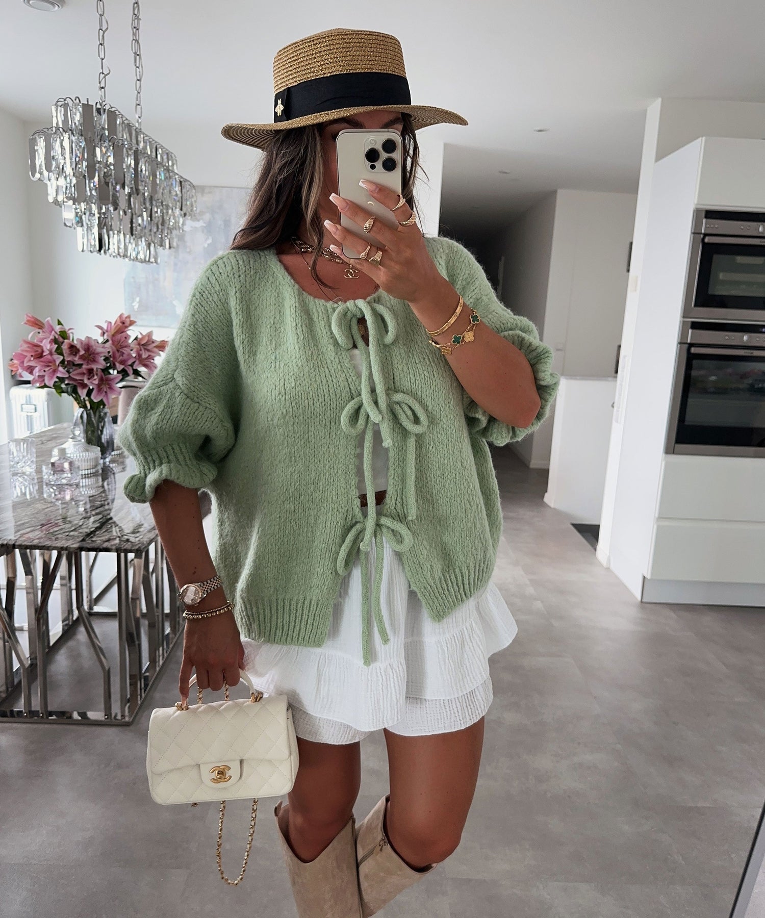 Der zarte Mintton bringt Helligkeit in jedes Outfit, ohne aufdringlich zu wirken, und lässt sich mühelos mit neutralen oder pastelligen Farben kombinieren. Die klare Schleifenform sorgt für vielseitige und stilvolle Einsatzmöglichkeiten.