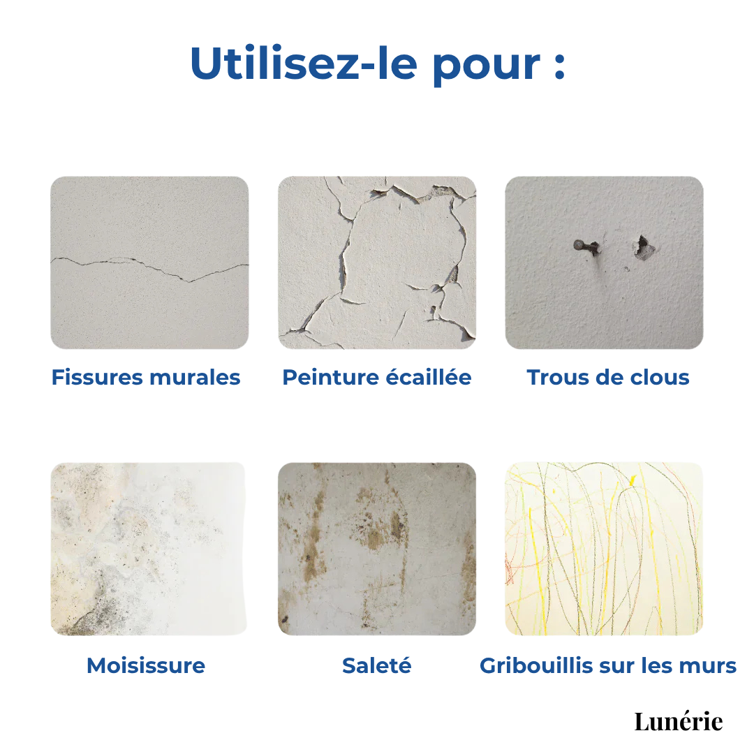 Verwendbar für: Risse, Nagellöcher, abblätternde Farbe, Schimmel, Schmutz, Kritzeleien