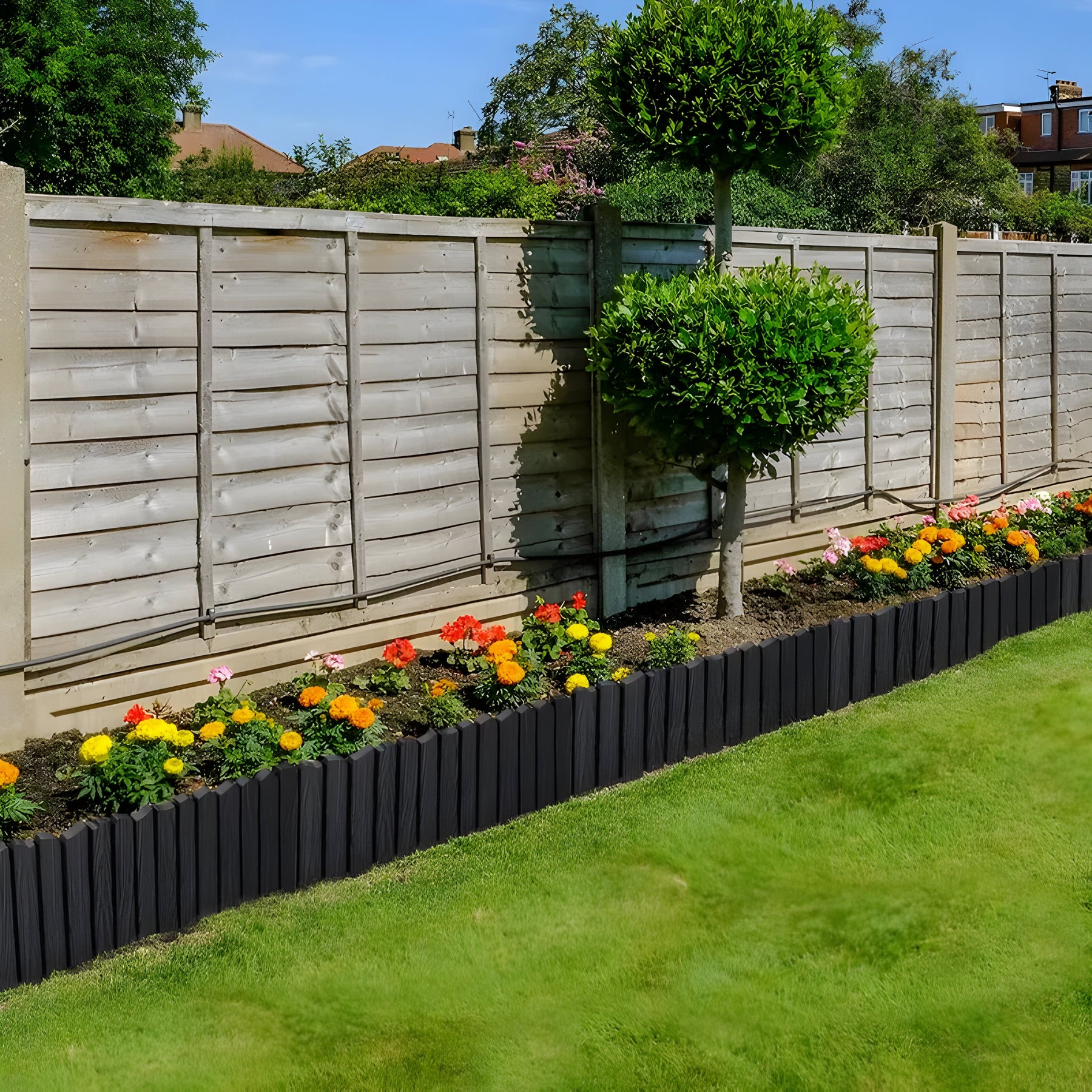 Die Rasenkante ist biegsam und lässt sich sowohl in geraden Linien als auch in geschwungenen Formen verlegen – perfekt für individuelle Gartengestaltungen. -