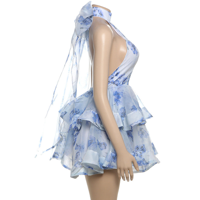 Valeria - Bedrucktes kurzes Kleid mit offenem Rücken und Neckholderausschnitt